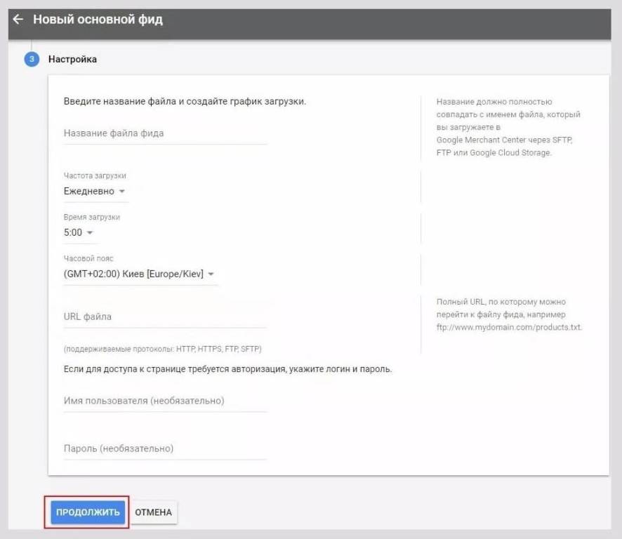 Следующий шаг — выбор места, откуда будет выполняться загрузка данных в Мерчант Центр и клик «Продолжить».