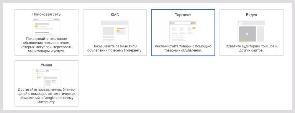 Задайте тип кампании («Торговая»).