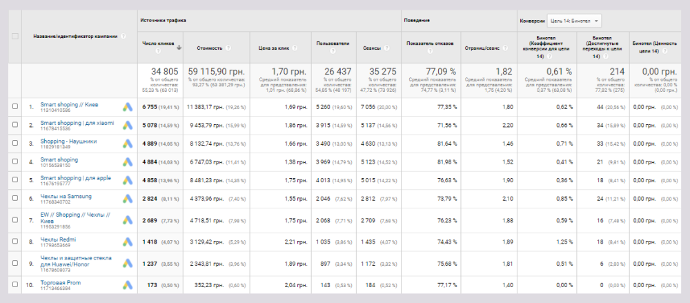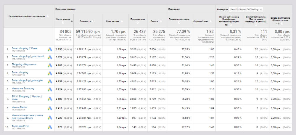 Рассмотрим особенности настройки в аккаунте Google Ads: