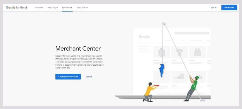 По сути, сервис является маркетплейсом или агрегатором, на котором посетители могут купить нужный товар. В качестве инструмента управления используется Merchant Center, в который необходимо загружать информацию о сайте продавца и ассортимент товаров.