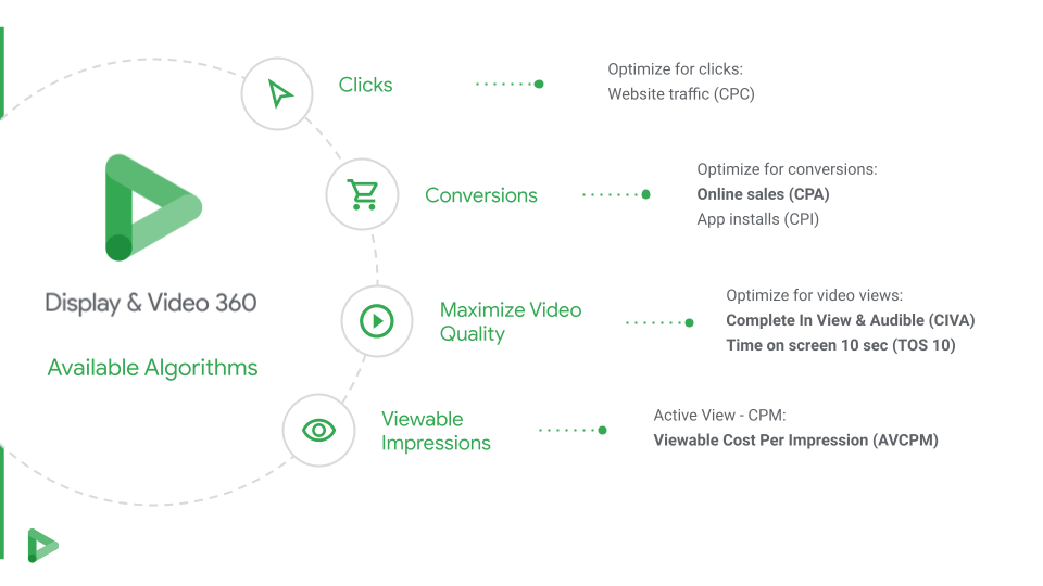 DV360 предлагает несколько стратегий, каждая из которых оптимизирована под определенный тип ожидаемого результата:
