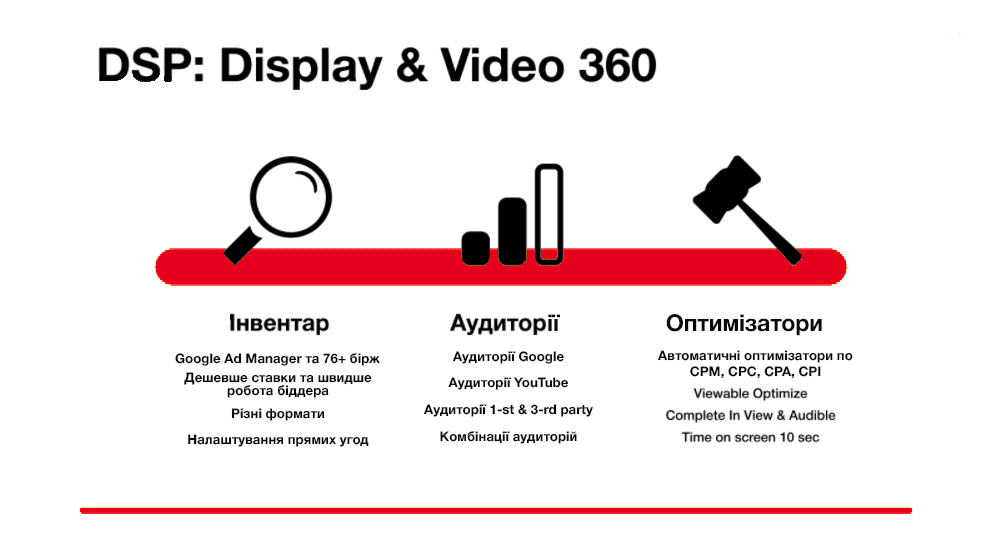 Display & Video 360 — это DSP-платформа профессионального уровня, которая используется для комплексного управления медийной рекламой. DV360 Google имеет расширенные инструменты для запуска рекламных кампаний разных форматов. Благодаря таким возможностям кастомизации, эта платформа является оптимальным решением для крупных компаний и маркетинговых агентств, заинтересованных в масштабировании. В целом, DV360 — это выбор тех, кому требуется максимальный контроль РК.
