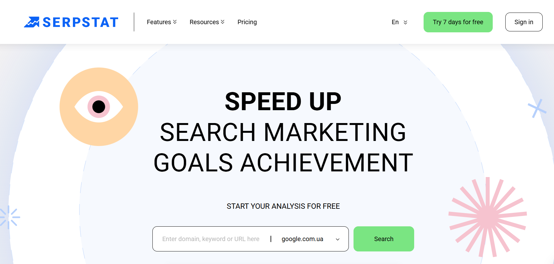 Чтобы узнать трафик сайта конкурента, осуществляющего деятельность за рубежом, подойдет SerpStat. Он демонстрирует данные о числе посетителей, количество частотных наименований и запросов, по которым ранжируется площадка, и другие показатели. Применение этого сервиса будет полезно в отслеживании изменений позиций после SEO, так как он показывает, насколько выросла посещаемость из поисковой выдачи Google.