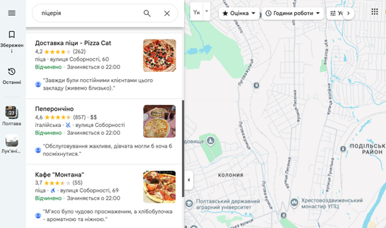 Практика показывает, что клиенты чаще выбирают компании, которые добавлены на карту с актуальными данными, фото и отзывами. Кроме этого, прямо в Google Картах можно запускать рекламу. И когда человек вводит запрос вроде «пиццерия рядом», он увидит именно ваше заведение.