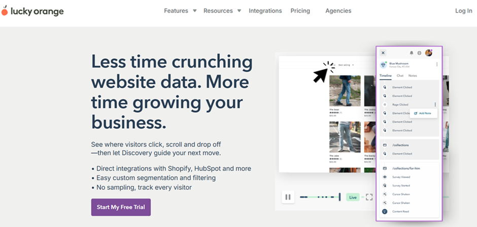 С помощью Lucky Orange можно увидеть тепловые карты, которые показывают, куда чаще всего кликают и как прокручивают страницы. Инструмент записывает сессии пользователей, которые воспроизводят их путь на платформе. Сервис также помогает выявлять проблемные места. Встроенные онлайн-чаты и опросы дают возможность сразу получать обратную связь от реальных пользователей и уточнять, что им удобно, а что — нет.