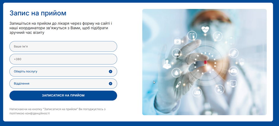 Затем мы занялись параметрами usability. Аналитика показала, что пользователи часто уходили, поскольку не могли быстро найти, как можно записаться на прием. Поэтому мы добавили удобные формы заявки прямо на главную страницу и в разделы с услугами. Теперь посетитель мог оставить заявку всего за несколько кликов.