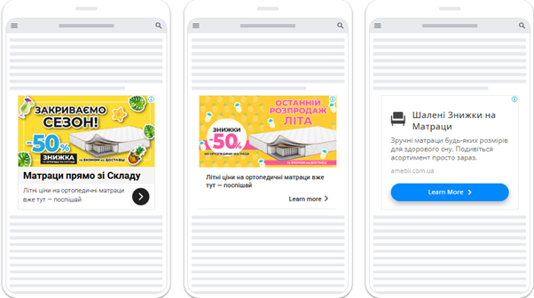- Комплексный адсет (фид + баннеры + тексты). Хорошо работает для стабильного расширения охвата и поддержки трафика.
