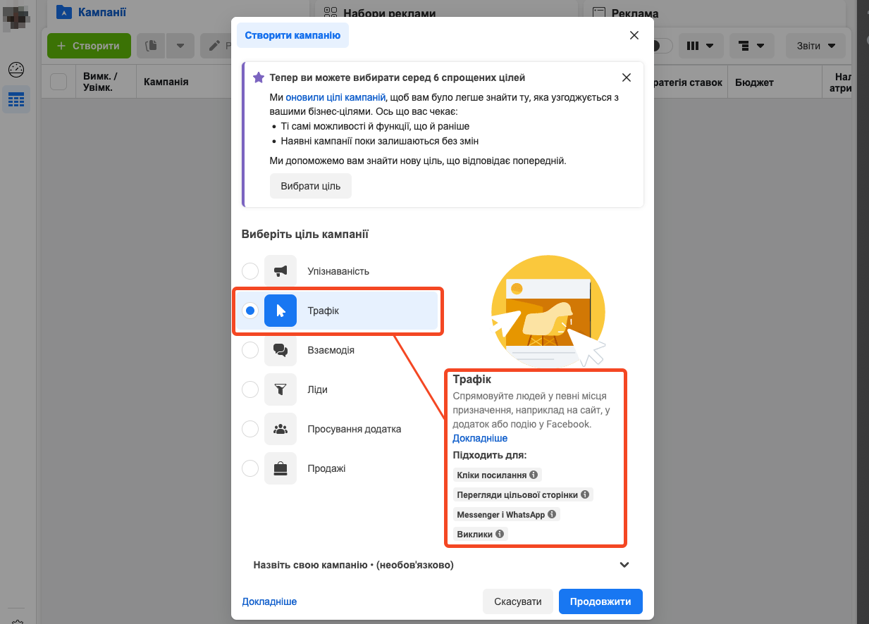 Мы в качестве примера выберем цель — «Трафик». А вы можете остановиться на той, что отвечает вашим потребностям. После этого нажмите «Продолжить». Дальше откроется вкладка, где вы сможете указать название РК, выбрать категорию и другие параметры.