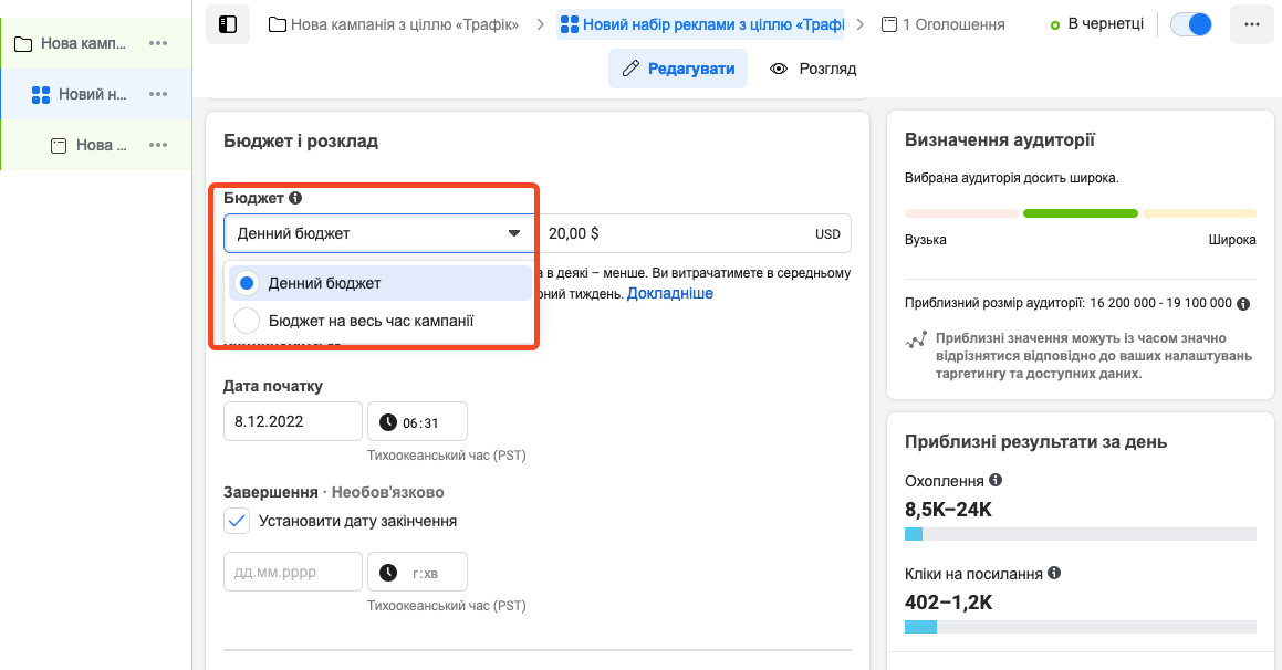Если вы только недавно начали работать с рекламой, мы советуем выбирать дневной бюджет. Ведь так легче следить за расходами и вносить изменения в случае необходимости. Но в целом выбор типа бюджета не критически важен. В этом же разделе мы также определяем дату начала и завершения кампании.
