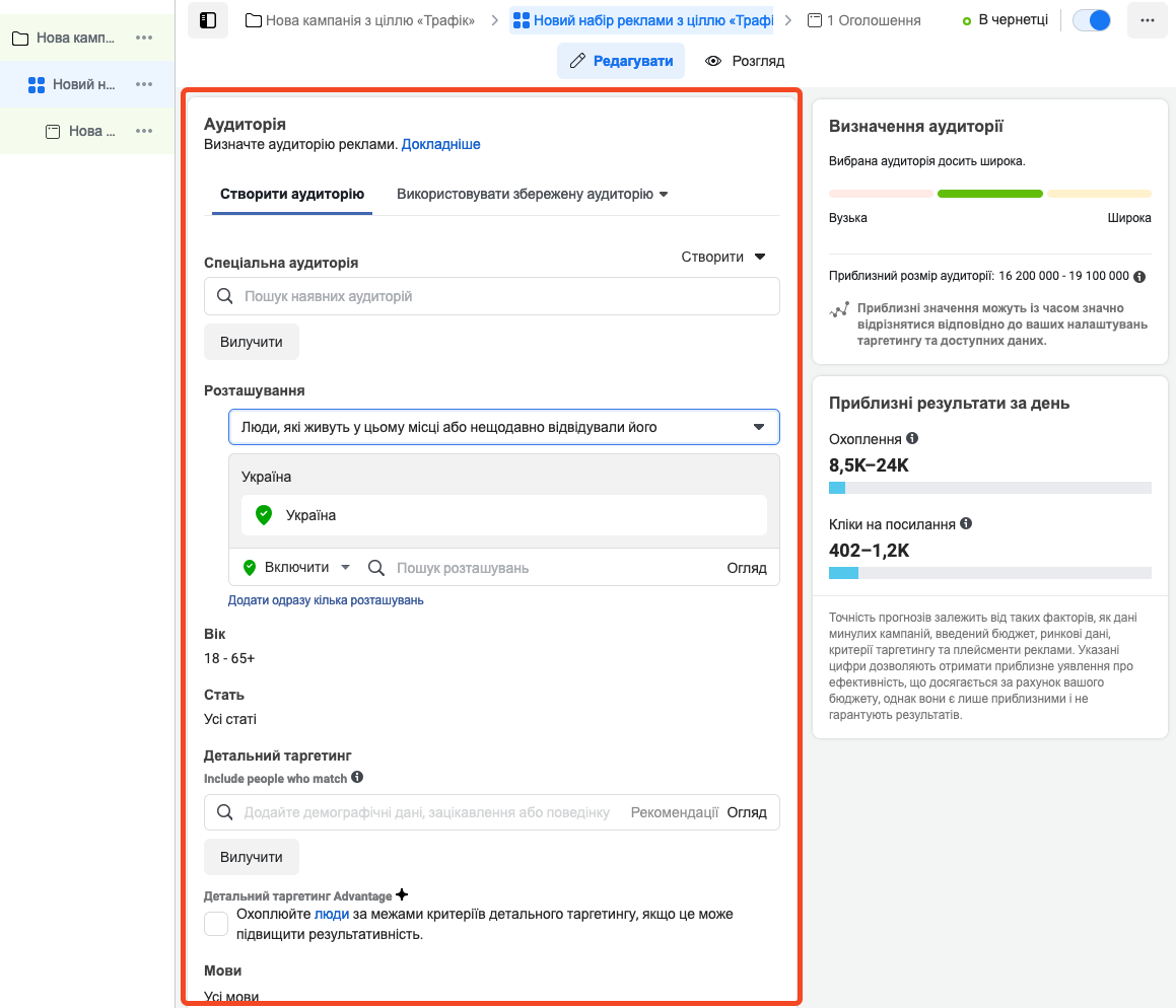 Дальше переходим к настройке аудитории. Ее нужно выбирать с учетом того, куда будет направлен ваш трафик: на сайт, в приложение и т. д. Лучше вручную настроить таргет, исходя из нюансов своей ЦА. Сгруппировать целевых пользователей можно по возрасту, полу, местоположению, интересам и другим параметрам. Понятное дело, что к данному этапу у вас уже должен быть готов портрет вашей ЦА.