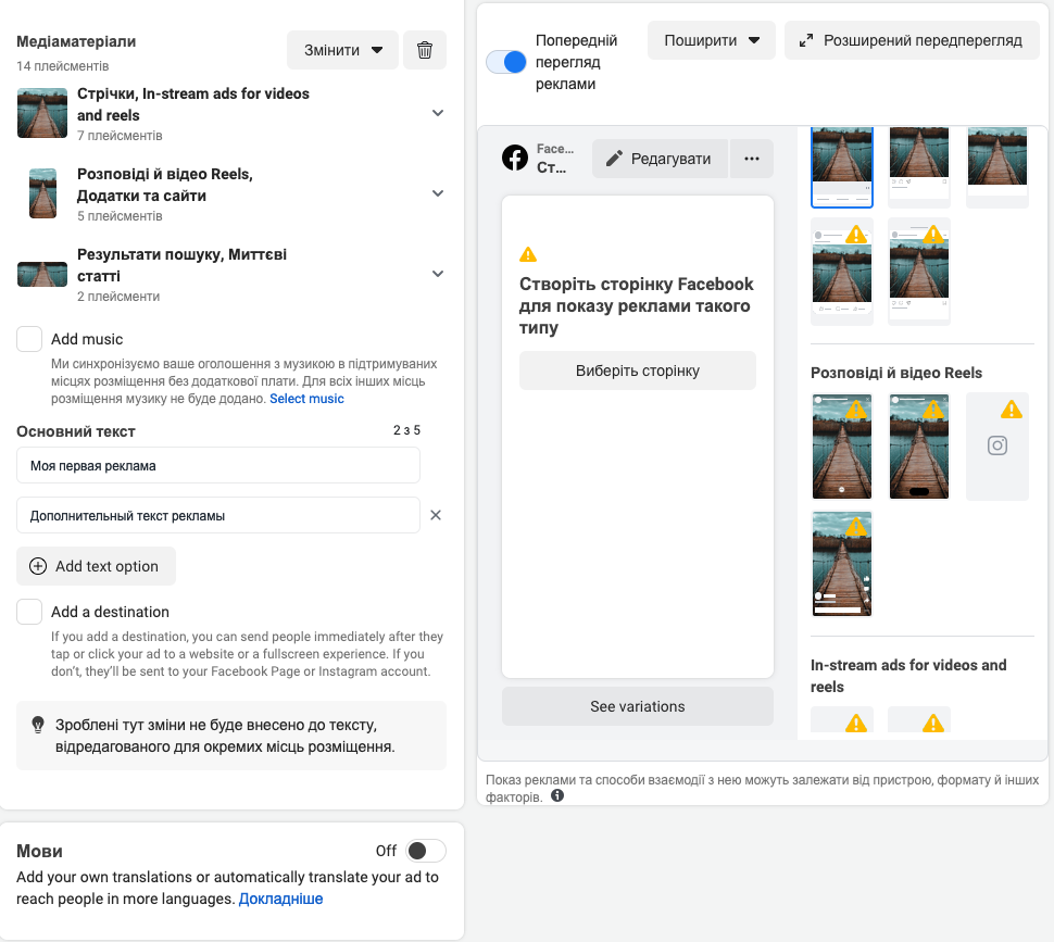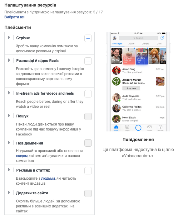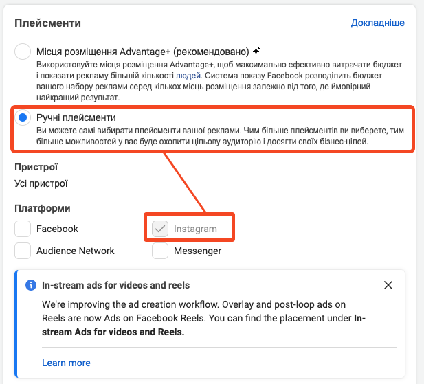 Определитесь с плейсментами — площадками, где вы хотите продвигаться. Если вам нужен только Instagram, уберите отметки со всех остальных.