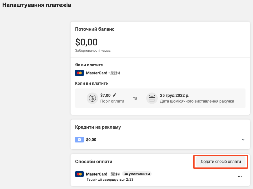 Чтобы оплачивать свои РК, нужно привязать карту. Сделать это можно в разделе «Настройки платежей» в Ads Manager. В дальнейшем вводить данные повторно не понадобится.