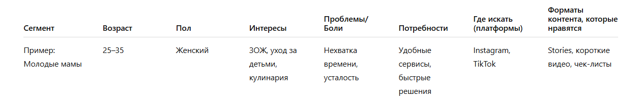 Например, вот так может выглядеть таблица для сбора данных о ЦА: