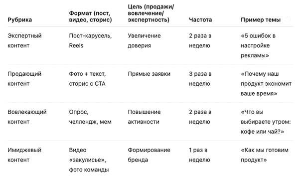 Далее нужно составить план задач, которые необходимо выполнить для достижения поставленных целей. Например, если вы хотите добиться роста вовлеченности, задачи могут включать публикации полезных постов, размещение опросов или других интерактивных сторис, запуск челленджей и т. д. Для роста продаж задачи будут другими: это могут быть запуск рекламы, разработка воронки, подготовка продающих рилс и т. д.