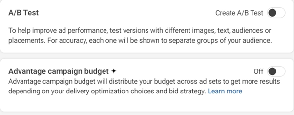 - Активируйте опции A/B-тестирование, чтобы определить, какие изображения и тексты наиболее резонируют с вашей целевой аудиторией, и Advantage. При выборе этой опции система распределяет ваш бюджет между различными группами объявлений в зависимости от их эффективности.