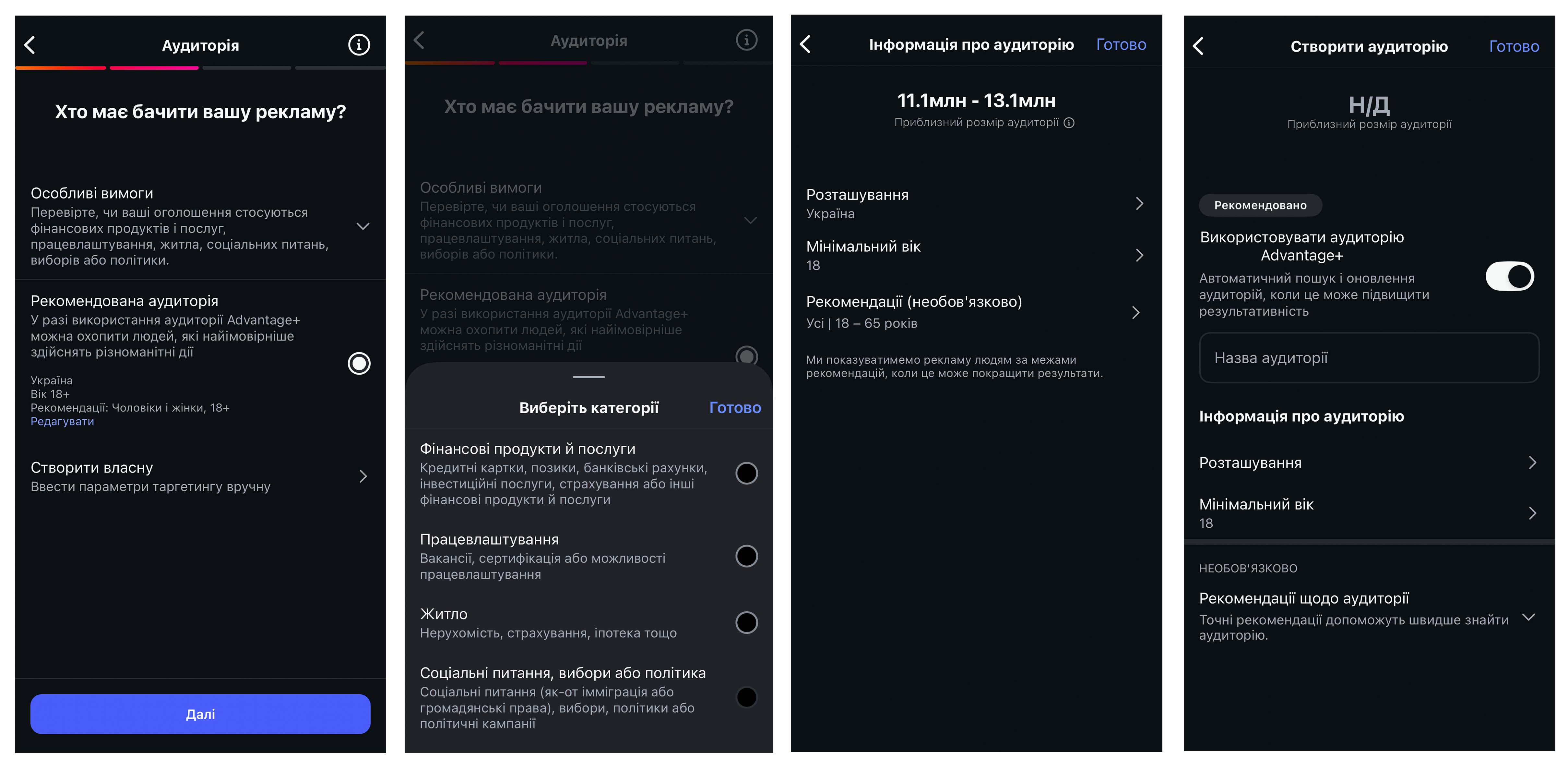 - После этого отредактируйте «Аудитории». Обратите внимание, как меняется ее размер при выборе опции Advantage+.
