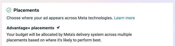- Выберите Advantage+ Placements для оптимизации мест размещения. Вам не нужно будет самостоятельно указывать плейсменты. Система сама оценит, на каких площадках показы более результативны.