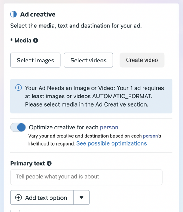 - Для автоматического улучшения рекламных креативов пользуйтесь инструментами Advantage Plus Creative. Система может регулировать яркость изображения, создавать анимацию, добавлять музыку и расширять изображения для различных вариантов размещения.