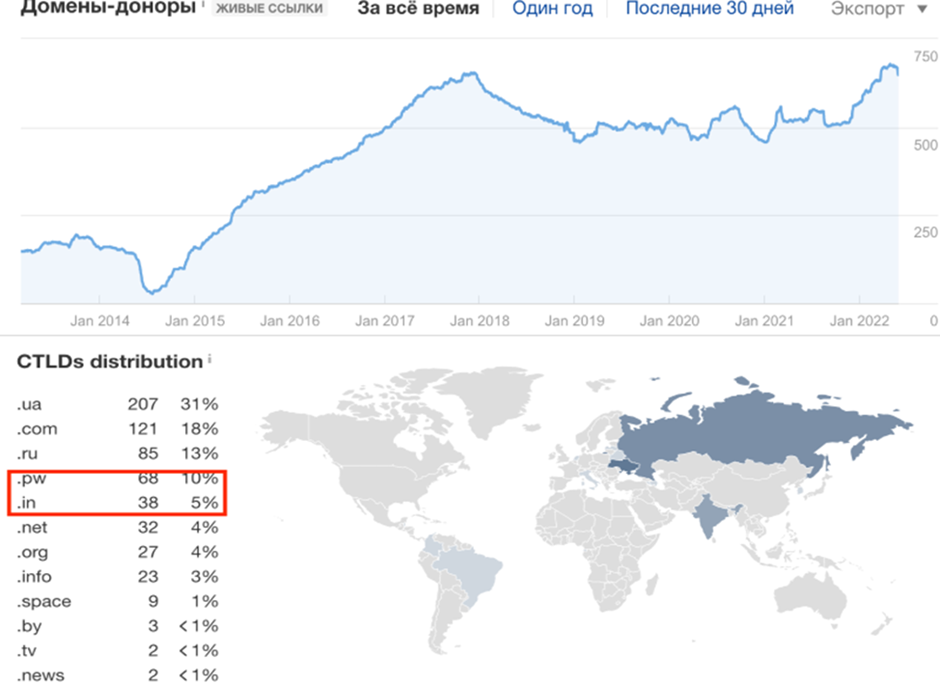 Также присутствовали ссылки низкого качества с доменных зон .pw и .in, которые мы рекомендовали почистить.