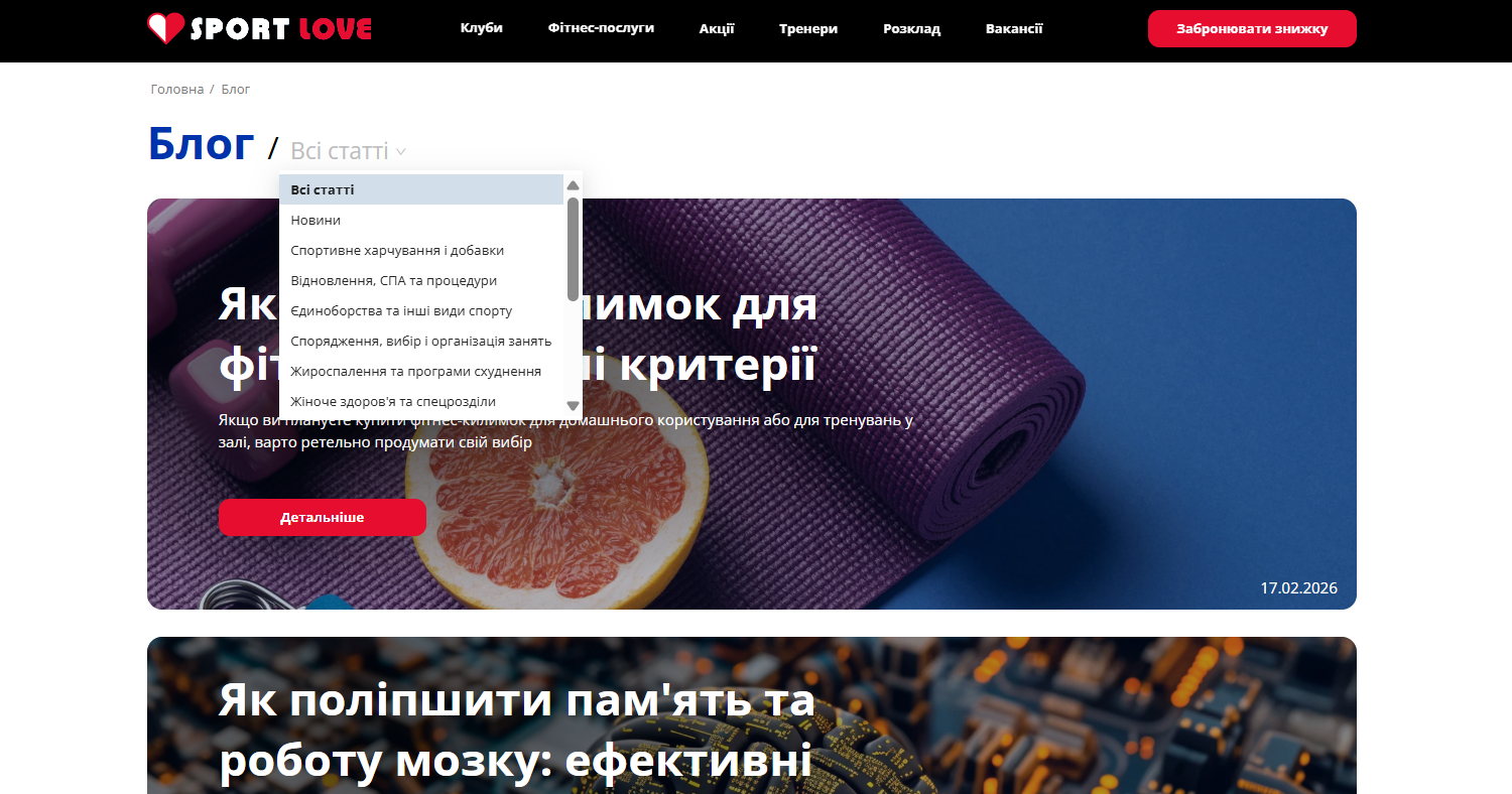 Параллельно с расширением семантики специалисты работали над структурой сайта. Они подготовили рекомендации по созданию новых страниц, а также определили, какие лучше удалить, а какие объединить. Они предложили развивать информационную составляющую сайта, чтобы привлекать пользователей, которые еще не приняли решение о покупке абонемента в спортзал, но задумываются об этом. В таких случаях очень помогает блог, который играет роль первого этапа воронки продаж — знакомства с брендом. Человек может искать «как похудеть за месяц», «лучшие спортзалы Киева», «как плавание влияет на здоровье» — и на этом этапе его можно заинтересовать. Блог стал изюминкой нашего проекта. Для удобства пользователей мы добавили возможность найти ту или иную статью по темам.