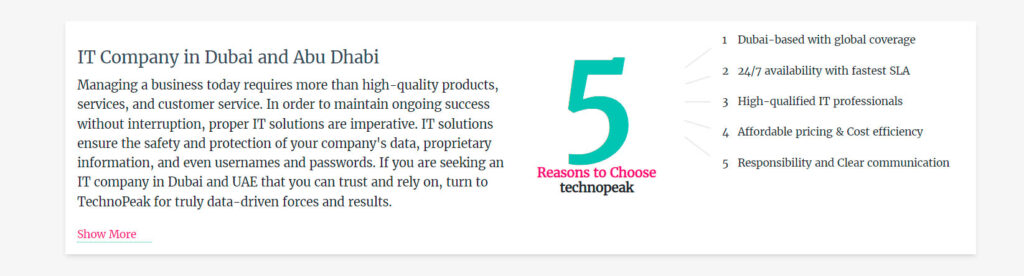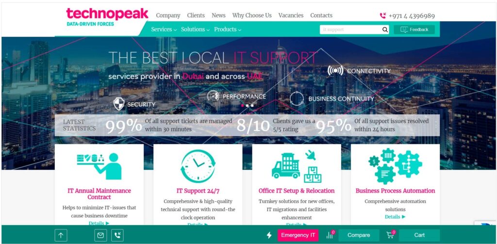 TechnoPeak — это высокотехнологичная компания, которая оказывает услуги клиентам в области ИТ аутсорсинга и кибер безопасности. Уже более 5 лет TechnoPeak признают одной из лучших локальных IT-компанией в ОАЭ. Среди основных направлений ее деятельности:
