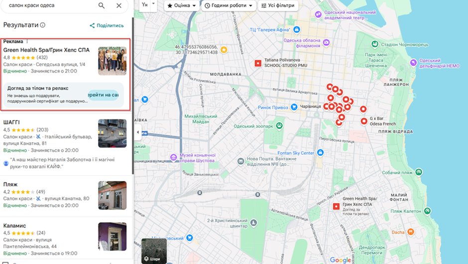- Над органічними результатами видачі відображаються рекламні посилання, релевантні запиту. На мапі рекламовані адреси позначені квадратами.