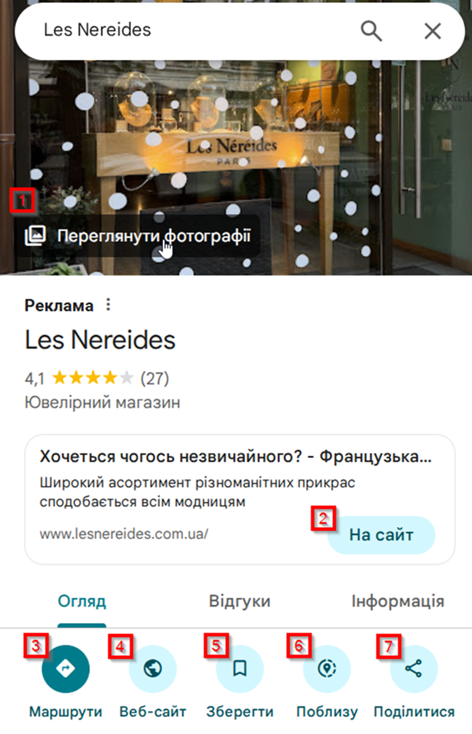 Щоб додати більше наочності, радимо завантажити в Google Мій бізнес фотографії в різних категоріях: Огляд, Інтер'єр, Фасад, Колектив та ін.