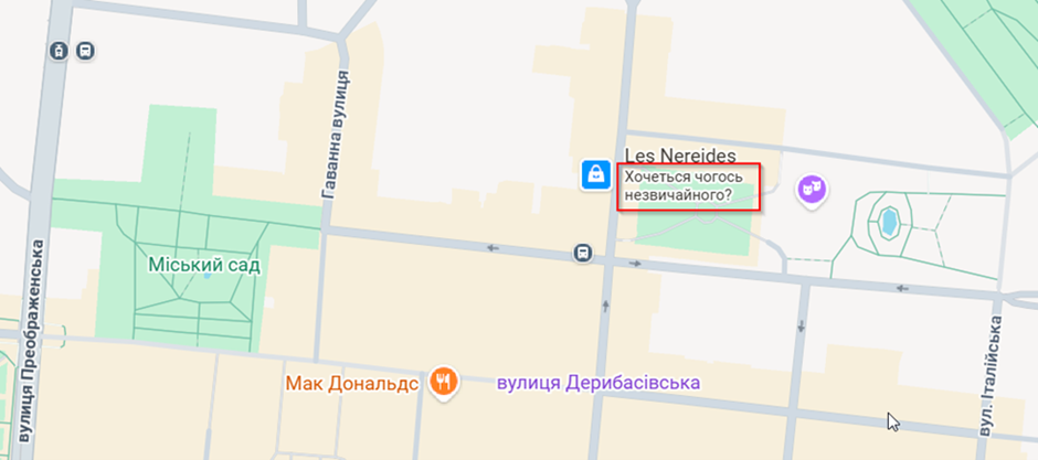 - Промовідмітки на карті. Під час вивчення карти або прокладання маршруту користувач бачить набір маркерів. Рекламовані місця можуть виділятися кольором, мати спеціальний підпис і спливаючу картку із закликом до дії. Такі позначки особливо ефективні в режимі перегляду району.