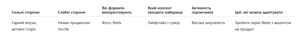 Наступний важливий етап — це аналіз конкурентів. Вам потрібно визначити, які формати контенту вони застосовують, які публікації отримують найбільше залучення, які рекламні кампанії використовуються. Звісно, повністю копіювати чужу стратегію просування не варто. Ваше завдання — вивчити слабкі та сильні місця, щоб уникнути допущених іншими помилок і розробити ефективніший план просування.