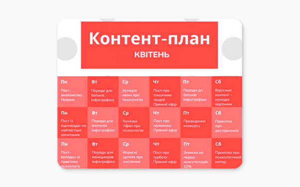 Стратегія просування у соціальних мережах обов'язково передбачає розробку контент-плану. У вас на руках має бути карта публікацій на тиждень, місяць чи квартал. Так ви зможете уникнути ситуації, коли пости публікуються в останній момент або по натхненню.