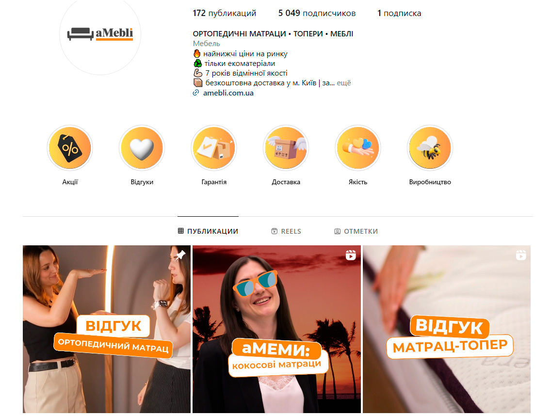 Ми розуміли, що сьогодні багато користувачів Інстаграму просто перегортають рекламні публікації, не звертаючи на них особливої уваги. Це називається ефектом банерної сліпоти. Щоб подолати це, нам потрібно було завуалювати наш заклик до дії та запропонувати креативний контент, наголошуючи на вирішенні проблем клієнтів та задоволенні їхніх потреб. Основою нашої стратегії стали відеоролики на різні теми: поради щодо вибору ортопедичних матраців, відгуки клієнтів, акції та знижки, а також переваги товарів Amebli.