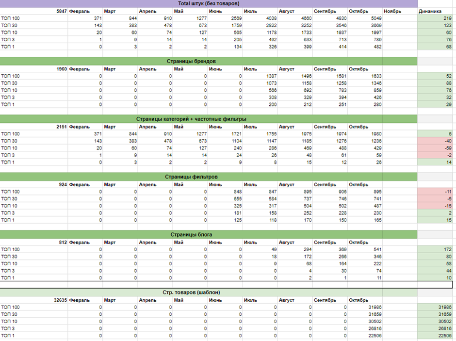 Нашими спеціалістами було зібране семантичне ядро за наданими пріоритетами, здійснено замір позицій, релевантних URL та частотності. Також вони підібрали 50+ тем для блогу, зробили шаблонне семантичне ядро для всіх товарів, підготували СЯ для нових сторінок.