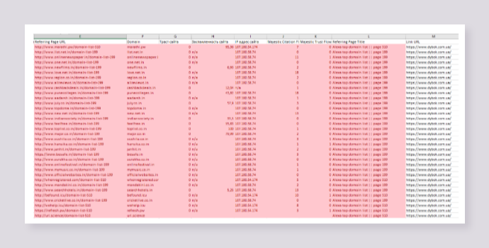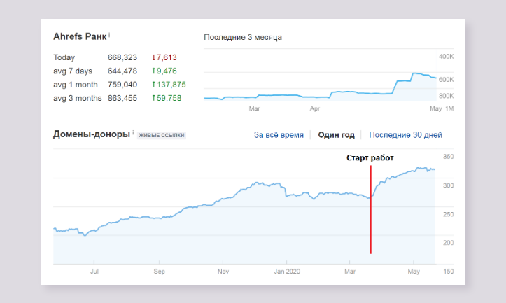 Крім нарощування посилань, були зроблені роботи з нівелювання впливу неякісних посилань. Ми зробили зріз якості всіх доменів, що посилаються, на сайті і відхилили ті, які не пройшли за критеріями якості: трастовість, відповідність тематиці, жива аудиторія та ін.