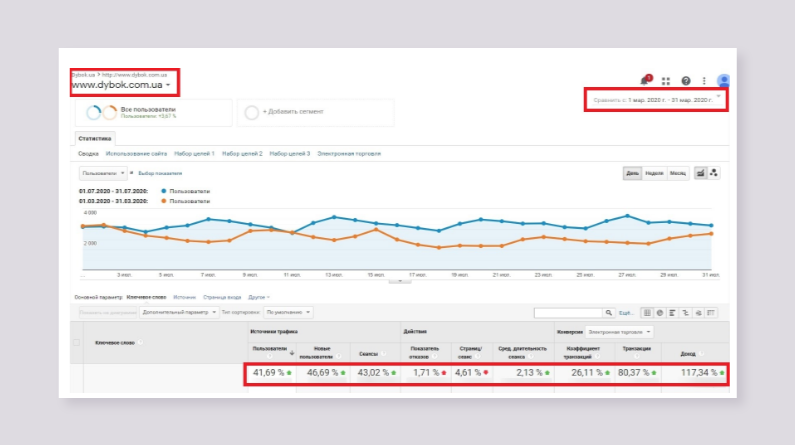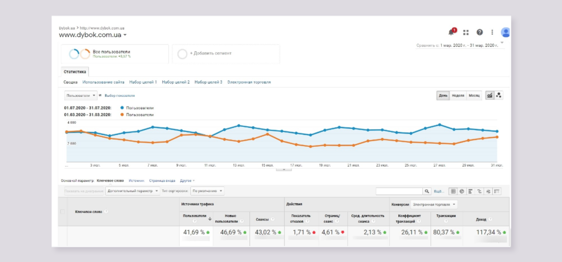 Особливо хочеться відзначити зростання кількості відвідувачів на 42% за 4 місяці робіт, зростання кількості замовлень в інтернет-магазині з пошукового трафіку на 80,4% та зростання доходу на 117,3%.