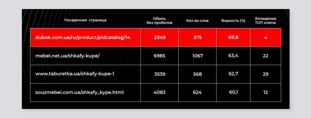Щодо контенту на сторінках сайту, то за нашими мірками він був недостатньо оптимізований. Для наочності розібрано тексти основних конкурентів із ТОПу видачі, проведено порівняння з нашим текстом за ключовим словом “шафа купе”.