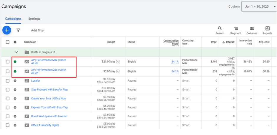 На наш погляд, ефективність була низькою через те, що для просування використовували лише кампанії Performance Max. Безперечно, це потужний інструмент, але поодинці він рідко забезпечує максимум віддачі. Тому ми запропонували протестувати інші формати: YouTube та контекстно-медійну рекламу. У ніші, де працює Luxafor, це було особливо важливо. Не завжди користувачі вводять у пошук запити типу «Busy Lights». Тому потрібно було привернути їхню увагу через візуальні формати.