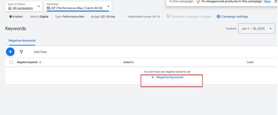 Ще один важливий момент — мінус-слова. Їх не було, і це призводило до показів за нерелевантними запитами. Додавання мінус-слів на рівні кампанії допомагає відсікти «сміттєвий» трафік, знизити витрати та спрямувати бюджет на цінніші кліки.