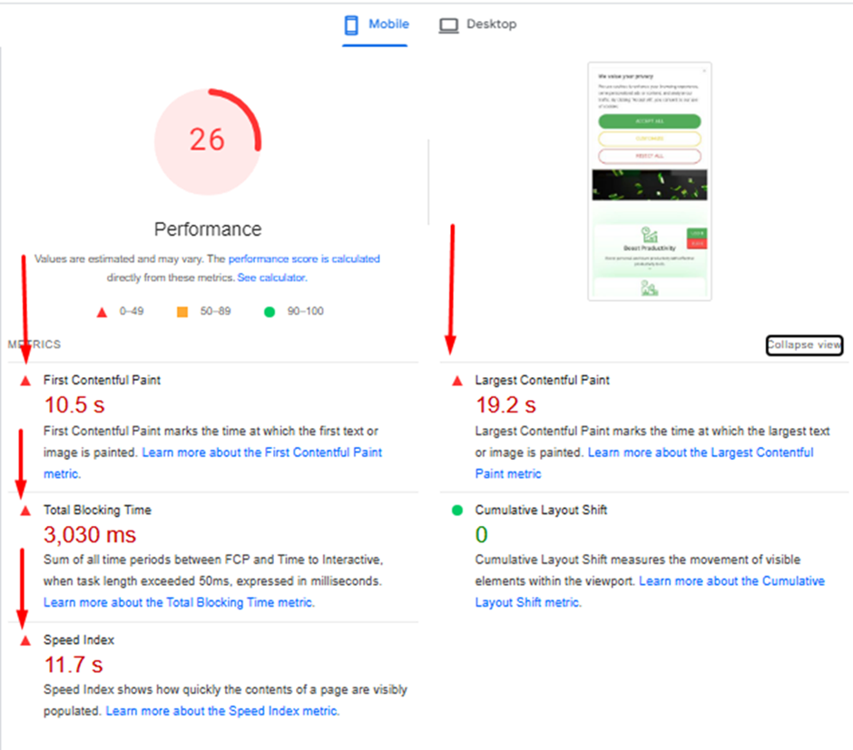 Перше, що впало у вічі, — це низька швидкість завантаження сайту. За даними Google PageSpeed Insights, головна сторінка показала всього 26 балів зі 100 на мобільних пристроях — це знаходилося в «червоній зоні». Для десктопа ситуація була не набагато кращою — 47 балів зі 100.