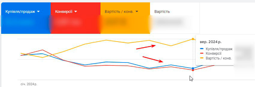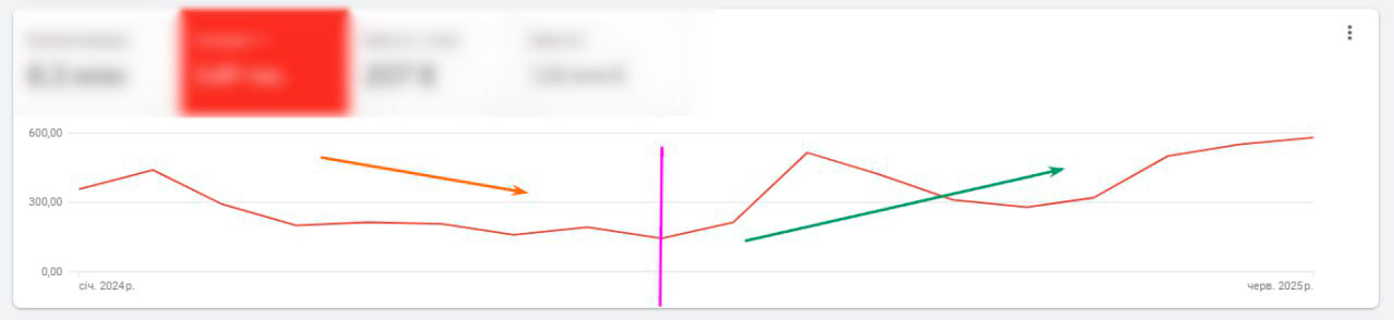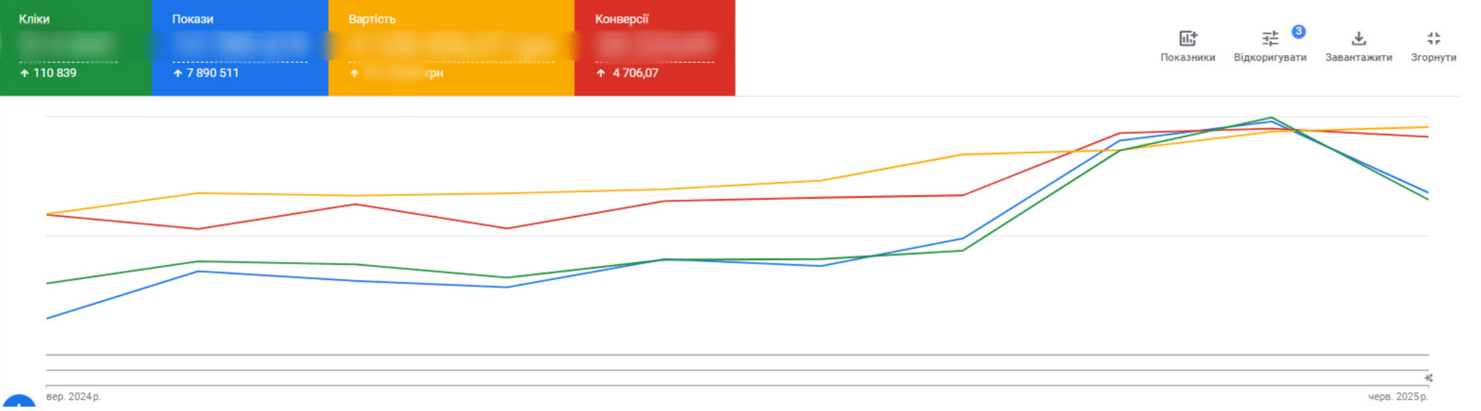 За період з вересня 2024 року по червень 2025-го, попри сплески та падіння, спостерігається зростання результативності реклами. Зокрема, число конверсій зросло майже на 43%. Особливо помітним є приріст окремих дій: