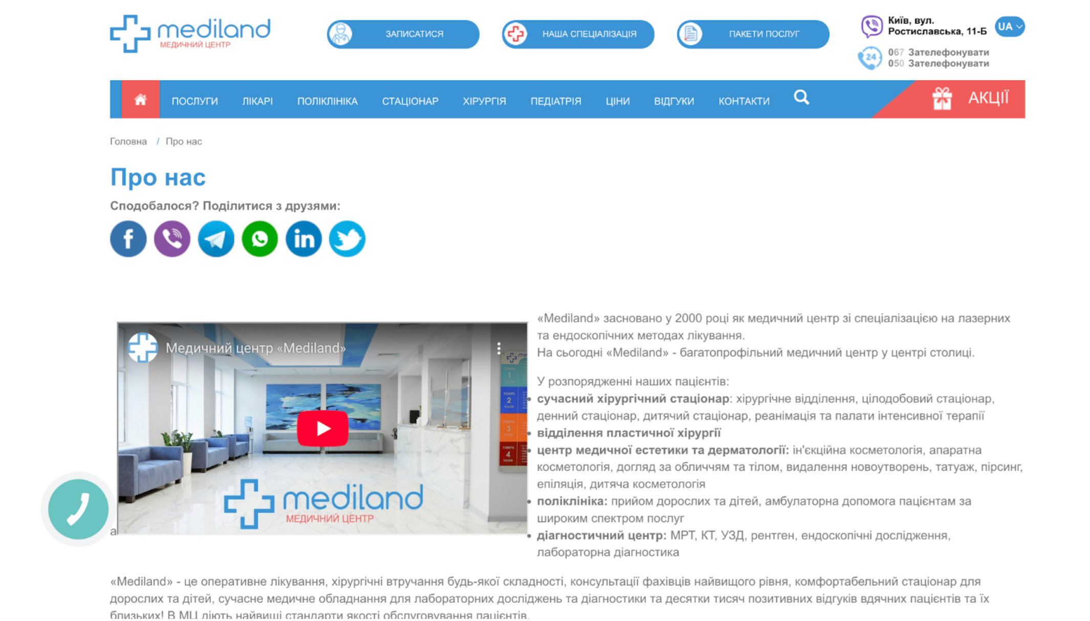 «Mediland» — один із відомих медичних центрів в Києві, який надає пацієнтам комплексну допомогу на всіх етапах лікування. Компанія працює з 2000 року та має репутацію клініки з високими стандартами якості, професійним підходом і підвищеним рівнем відповідальності з боку лікарів.