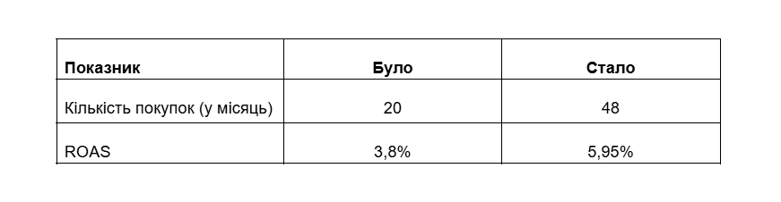 Одним із найважливіших наших результатів стало збільшення кількості покупок у 2,4 раза. Загальна щомісячна сума продажів зросла у 4,2 раза.