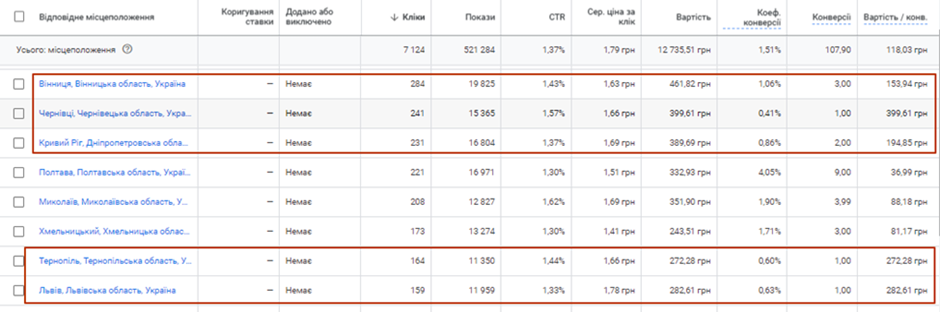 Ми також детально вивчили структуру кампаній. Виявилося, що рекламу запускали без урахування регіональних особливостей. У результаті в окремих містах вартість заявки була надто високою, при цьому саме ці кампанії поглинали значну частину бюджету.
